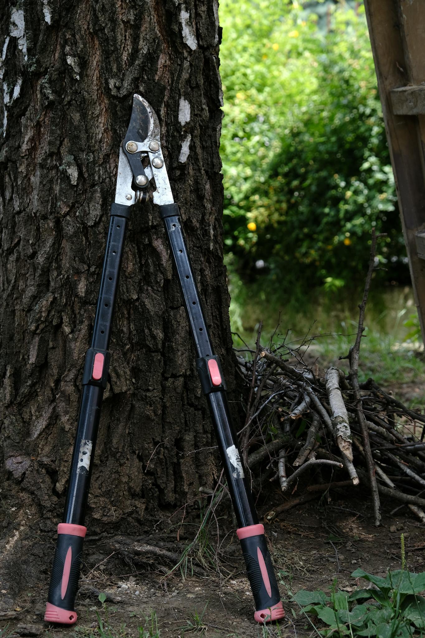 A pair of pruning shears lean against a tree with branches in a garden setting.
